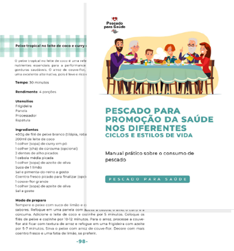Pescado para promoção da saúde nos diferentes ciclos e estilos de vida: manual prático sobre consumo de pescado, publicação do Núcleo de Pesquisas Pescado para Saúde que tem como objetivo esclarecer dúvidas relacionadas ao pescado, além de trazer informações úteis para o seu consumo em todas as fases de vida, desde a gestação até a velhice. O pescado – que inclui peixes, camarão, siri, caranguejo, ostra, mexilhão, polvo, lula, jacarés, rãs, ouriços, pepinos-do-mar e algas – é fonte de proteína de alto valor biológico, além de ser uma carne com reduzido teor de gordura. O consumo desse alimento ajuda a atender às necessidades de selênio, vitaminas A, D, E, K e diversos outros nutrientes que são fundamentais para o funcionamento do organismo humano. Além de informações, este livro traz exemplos práticos e também receitas de como inserir o pescado na alimentação do dia a dia, com peixes não convencionais para ajudar a explorar espécies não tão conhecidas, mas saborosas e nutritivas. Leia o livro na íntegra clicando aqui.