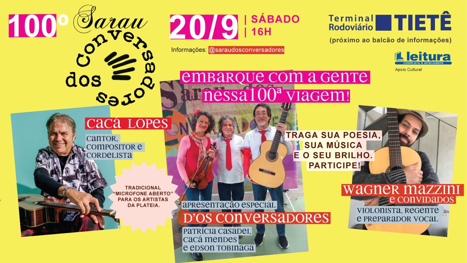 É com muita alegria e encantamento que chegamos à centésima apresentação do nosso Sarau dos Conversadores. Pois é com ele que nos externamos, é com ele que dialogamos, é com ele que vamos conhecendo pessoas, indo ou voltando, pessoas que têm na “rodoviária” o seu ponto de chegada ou partida, na esperança de uma vida melhor ou simplesmente um encontro.