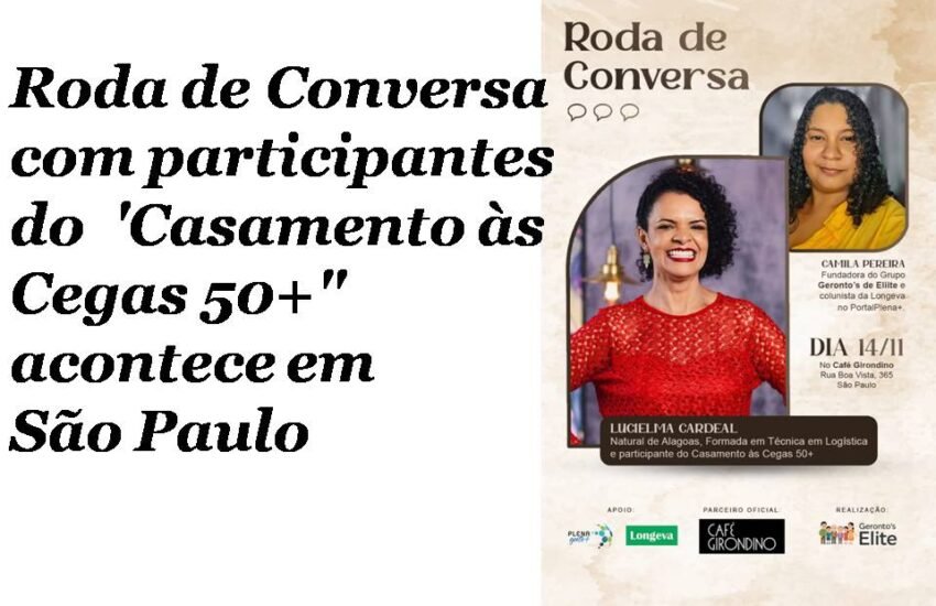 Pois, a proposta dessa Roda de Conversa é totalmente original. Nela estarão presentes três ex-participantes do reality “Casamento às Cegas 50+” que reuniu mulheres (e homens) a partir dessa faixa etária para “encontrar o amor sem se basear na aparência física”.